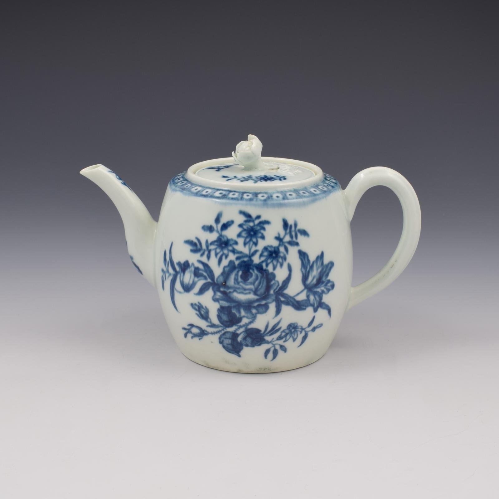 Worcester Porcelain Miniature Blue & White Barrel Teapot Rose Centred Spray c.1770 (1 of 18)
