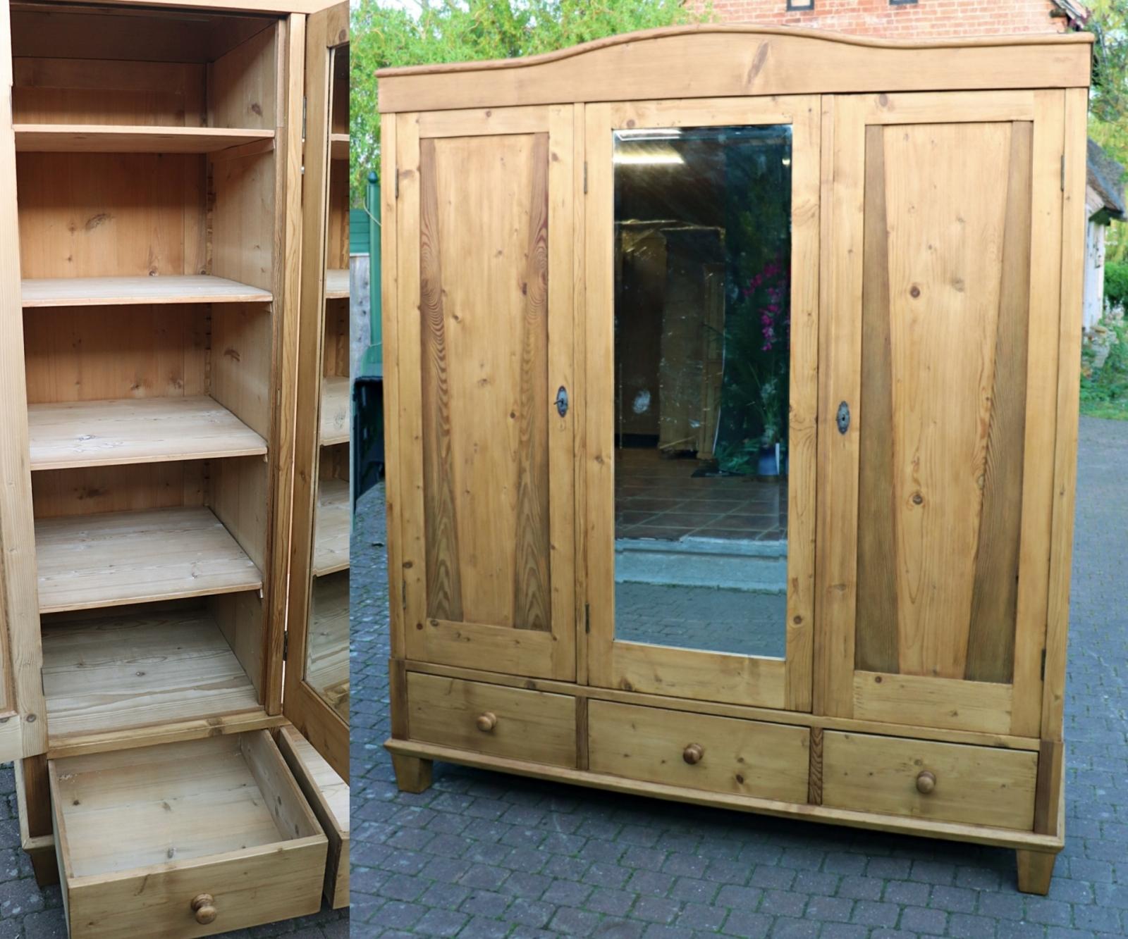 An absolutely beautiful old triple door pine combination wardrobe, hand waxed with a fantastic old pine colour. Fabulous quality from our best wardrobe restorer/ supplier! Dating from the early 20th century and continental in origin. Original bevelled mirror with some light marks and a little foxing. Unusual detailing on the doors with contrasting pine.