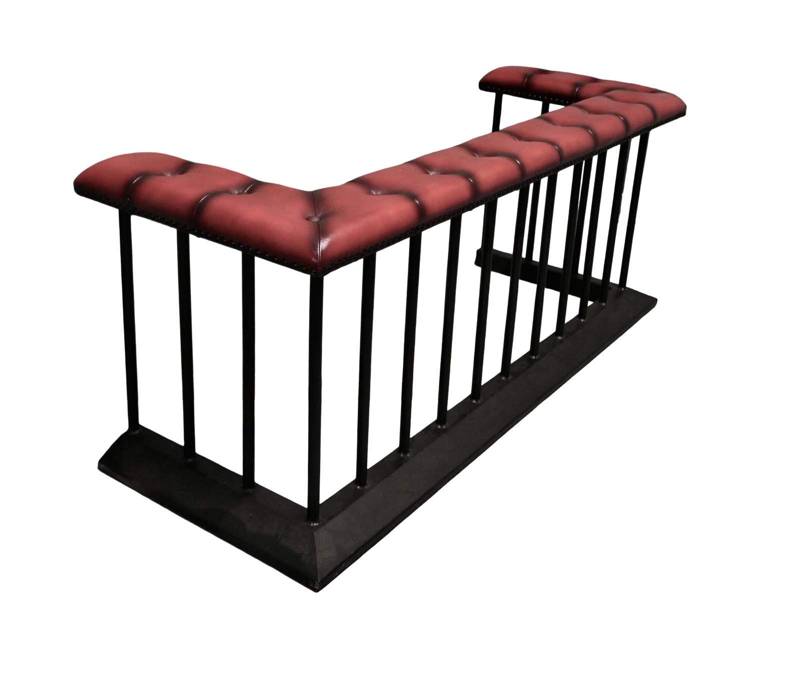 This is a grand piece of Country Furniture with its buttoned and studded red leather upholstered seat. The fender is in good looking and sturdy condition and the 6.5” wide soft brown leather is also in good condition. The fender is set on an iron base, it has upright rails and has plenty of room for several sitters wishing to feel the heat from the fire.