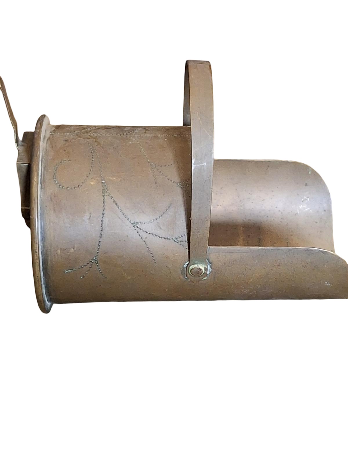 A lovely piece of WW1 trench art a German shell case that has been turned into a sugar /salt scuttle it has punched decoration, and the name of the French town Bapaume and the date 1917 punched into the interior lip it has a carrying handle like a real coal scuttle and also a hand crafted scoop which sits in its own holder the case is marked