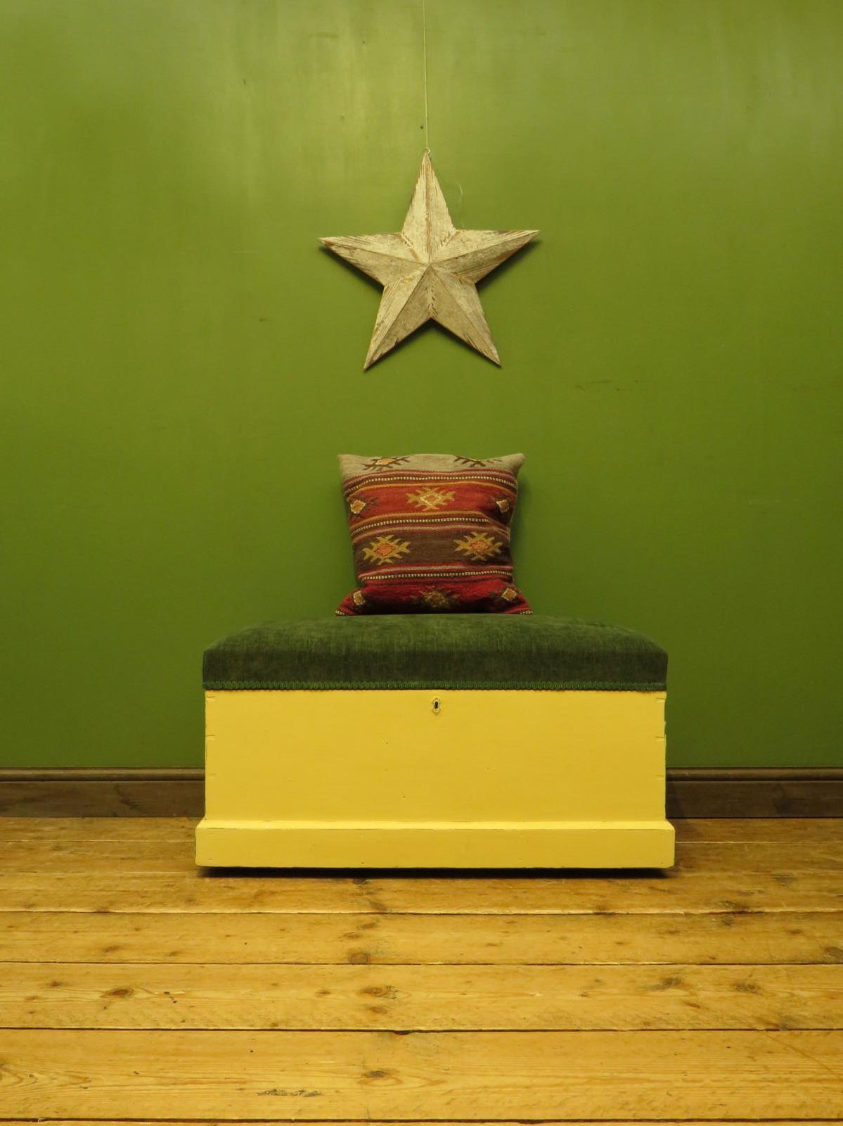 Yellow Blanket Box with Upholstered Lid in Green Fabric