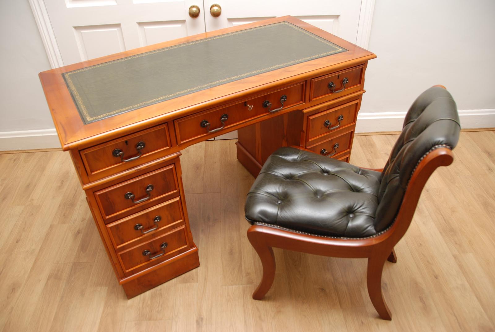 Yew Twin Pedestal Green Leather Top Writing Desk & Desk Chair